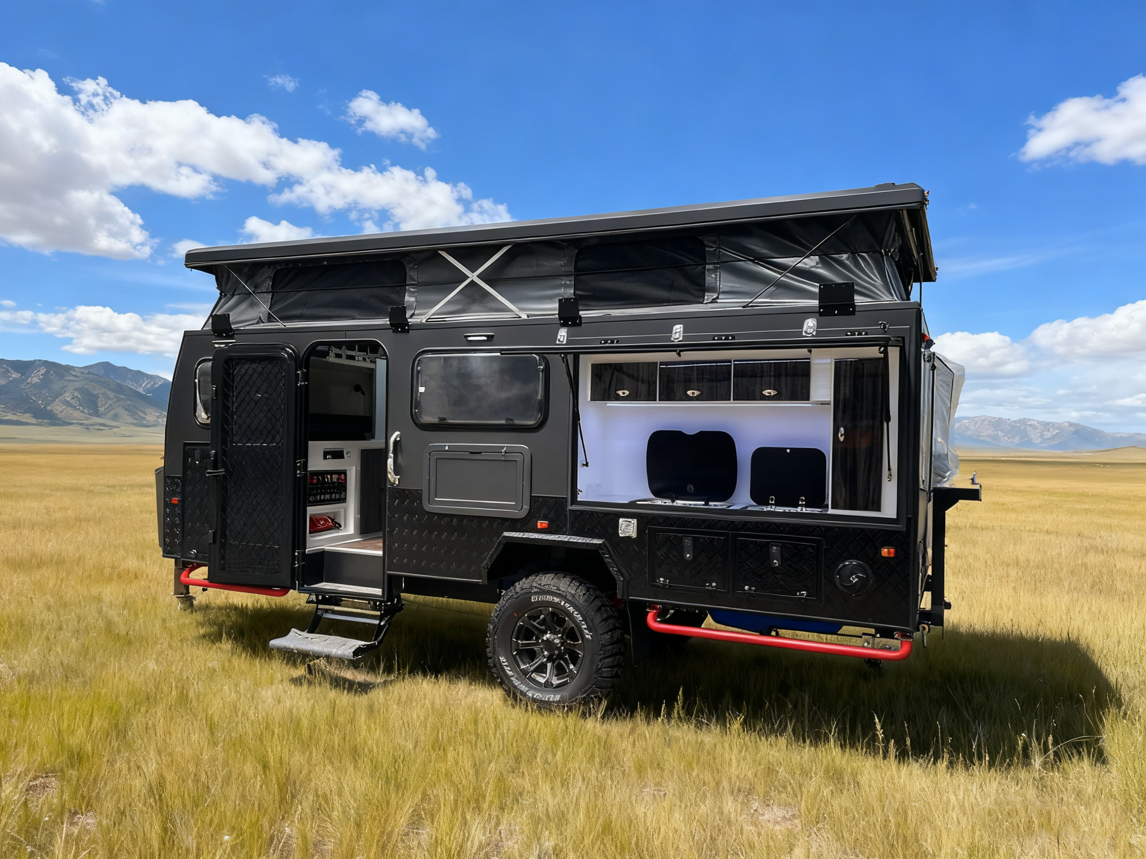 Allroad's lightweight aluminum hardtop camper is designed for off-road adventures. It provides a durable and spacious solution for camping trips. It features a strong aluminum and fiberglass construction to ensure long-lasting performance. The camper is lightweight and easy to tow and control.
